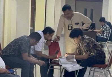 Setelah cukup lama melakukan penggeledahan, polisi kemudian memeriksa dokumen tersebut satu per satu. Salah satu penyidik tampak serius ketika mengecek berkas tersebut.