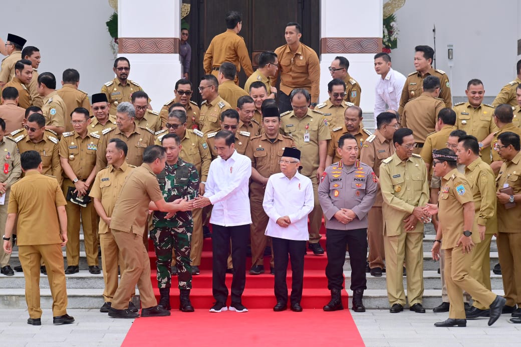 Para kepala daerah terlebih dahulu berkeliling bersama Menteri Dalam Negeri Muhammad Tito Karnavian di kawasan inti pemerintahan, sebelum menerima pengarahan dari Presiden Jokowi
