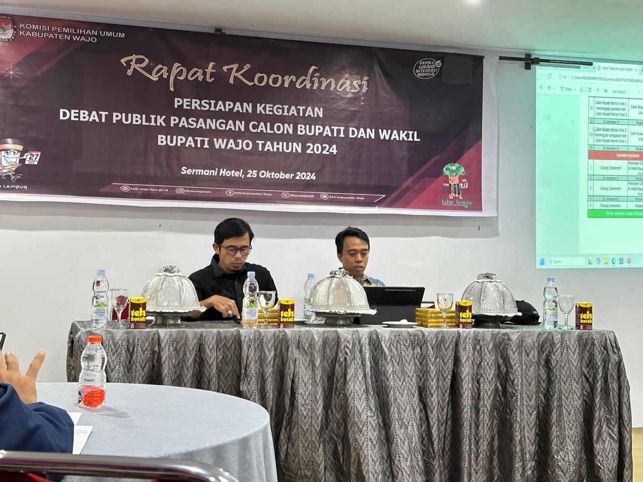 Hal itu disampaikan oleh Komisioner KPU Wajo Divisi Sosialisasi, Pendidikan Parmas dan SDM, Muh. Erwin Arifin, di rapat koordinasi persiapan kegiatan debat publik pasangan calon (Paslon) Bupati dan Wabup Wajo, di Hotel Sermani Sengkang, Jumat, 25 Oktober.