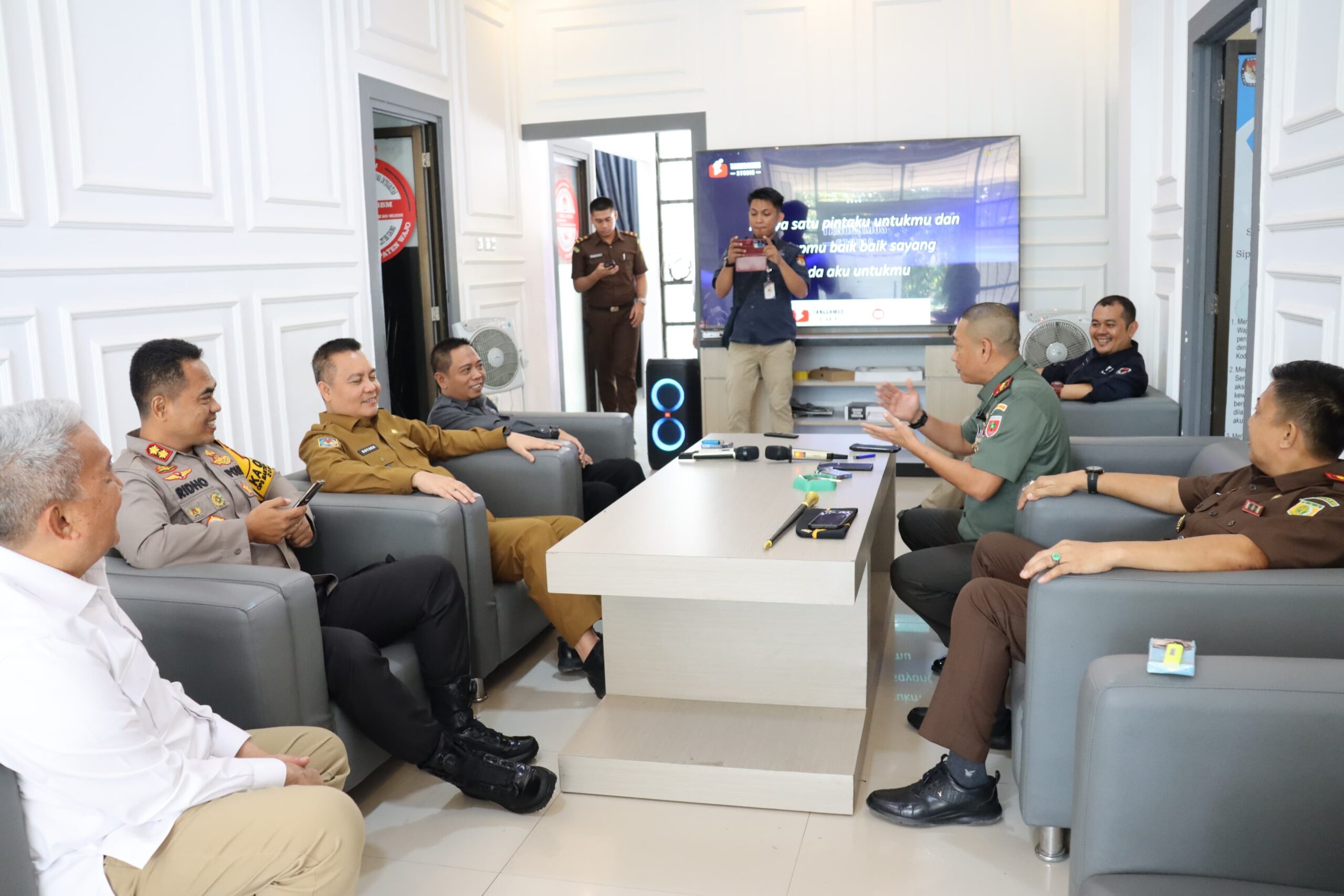 Nampak Pj Bupati berdiskusi dengan Paslon Pammase dengan suasana santai yang diselingi dengan canda dan tawa bersama.