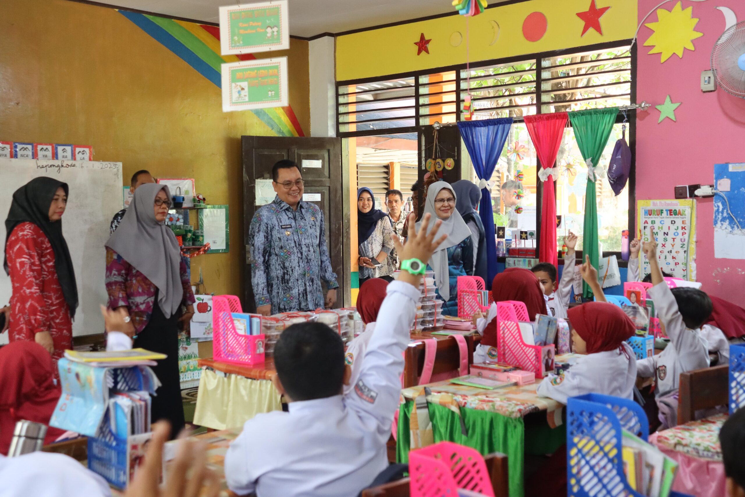 Bataralifu memasuki ruang kelas, sambil mengajak siswa SD berbincang bincang dan melihat pembagian makanan gratis di dalam kelas.