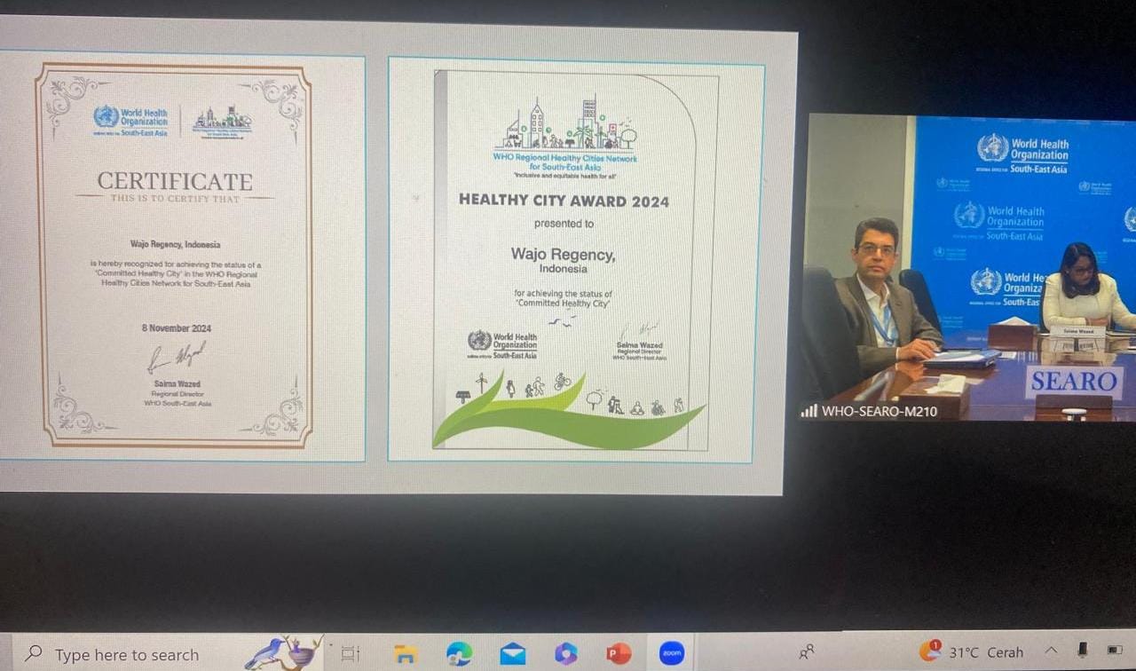 SENYAWAINDONESIA.COM, WAJO-Kabupaten Wajo berhasil meraih penghargaan sebagai kota Sehat Level 1 dari World Health Organization (WHO) Regional Asia Tenggara. Pemberian penghargaan digelar di Aula Bappelitbangda Wajo melalui zoom meeting Jumat (28/3/).