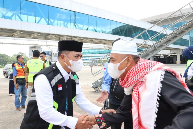 MSI, WAJO — Bupati Wajo bersama Ketua TP PKK Kabupaten Wajo dan Kepala Kantor Kementerian Agama (Kemenag) Kabupaten Wajo menyambut kepulangan jamaah haji asal Kabupaten Wajo di Bandara Sultan Hasanuddin Makassar, Kamis (3/7/2025).